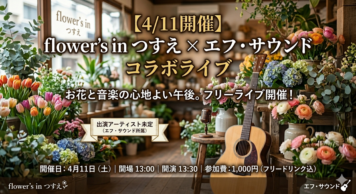 普段はお花をお買い求めいただく場所ですが、この日は「音楽」という新しい彩りが加わります。フリードリンクを片手に、リラックスして音楽に身を任せていただければ幸いです。